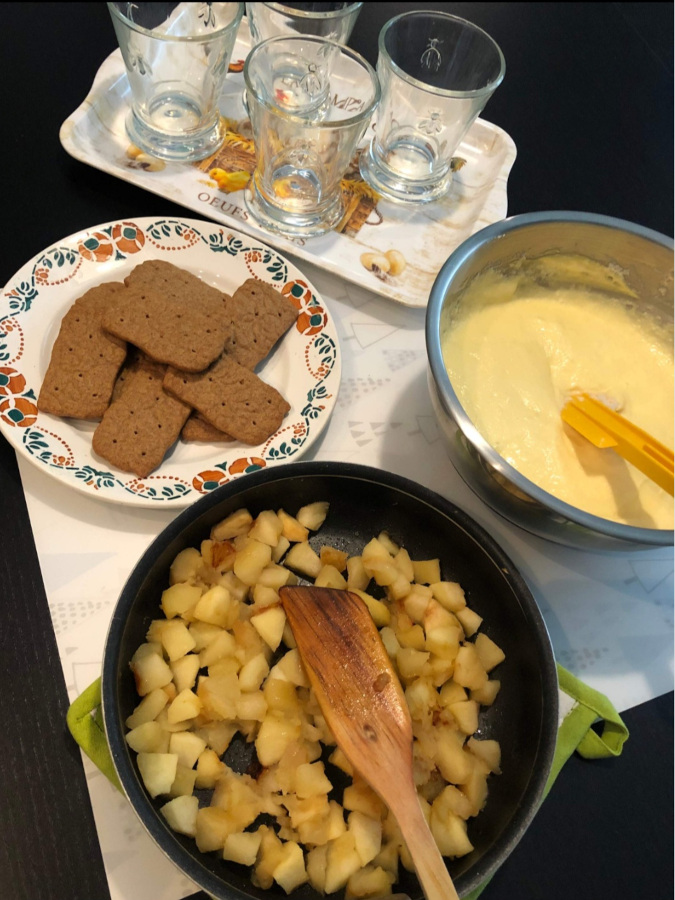 *N.B. : si vous n’avez de spéculos, vous pouvez prendre n’importe quel type de biscuits sablés et rajouter de la cannelle au moment de la cuisson des pommes. Si vous n’aimez pas la cannelle (comment est-ce possible ?!), vous pouvez utiliser des palets bretons et rajouter 2 cuillères à soupe de caramel aux pommes après cuisson.