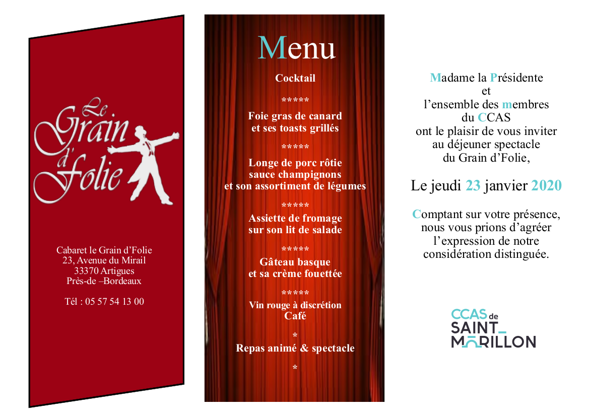 Invitation au repas des ainés pour les Saint-Morillonnais et Saint-Morillonnaise de 65 ans et plus le jeudi 23 janvier 2020
